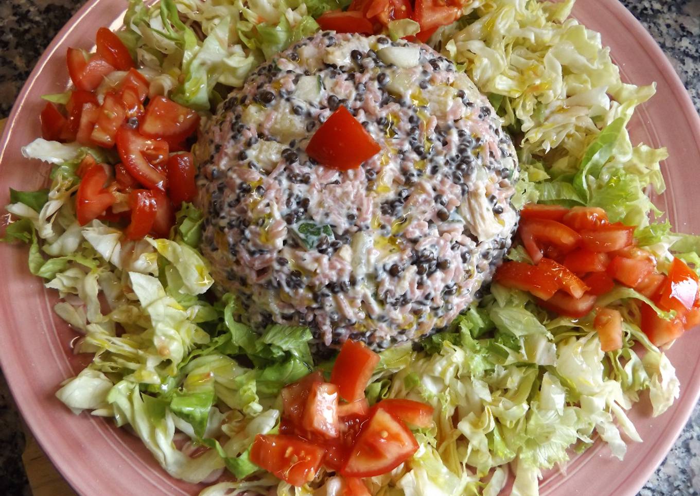 - Poder en una ensaladera el arroz las lentejas, el atún, el pepino, las mazorquitas y una cucharada de alcaparras. Reservar el tomate. Mezclar la mayonesa con los condimentos.