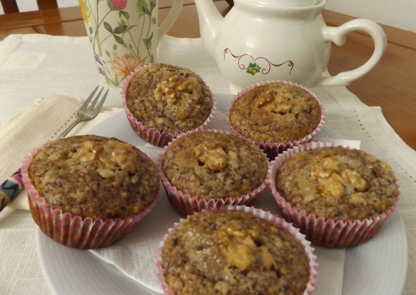 - Agregar al batido las harinas y el cacao. Mezclar bien. Incorporar las nueces picadas y pasadas por harina. Poner moldecitos de papel en un molde de magdalenas y verter la masa hasta el ¾ de su capacidad total. Espolvorear con azúcar y adornar a gusto. Llevar a horno precalentado a 180ºC durante unos 18´o 20´. Enfriar en rejilla.